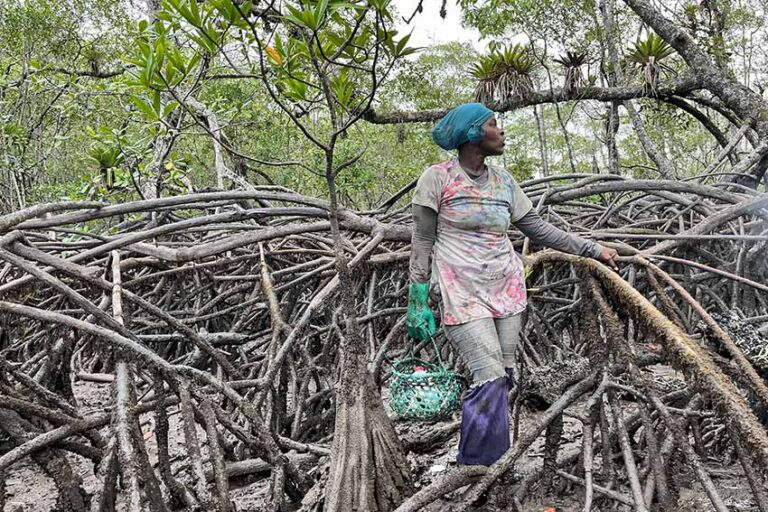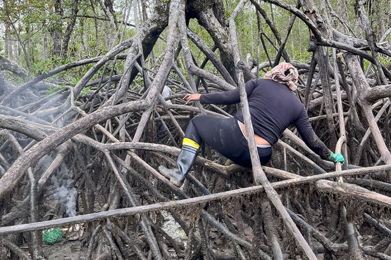 En el manglar, la risa desparpajada de Benita —51 años, cinco hijos, “varios nietos”— se multiplica. Se mete como en una cámara de ecos y, aunque esté lejos, sus compañeras la escuchan. El canasto de bejuco donde va metiendo las piangüas no se llena todavía, pero parece contenta, se divierte. Es como una niña chiquita con juguete nuevo cada vez que se trepa y se arrastra por debajo de las raíces larguísimas y entrelazadas de este manglar que parece existir desde el principio de los tiempos.