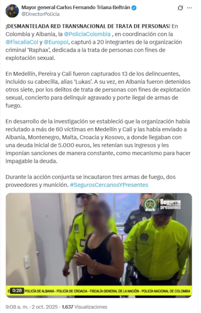 La Policía Nacional de Colombia (Ponal) desarticuló una estructura transnacional dedicada a la trata de personas con fines de explotación sexual, conocida como ‘Raphax’, tras una serie de operativos coordinados con la Fiscalía General de la Nación y agencias internacionales.