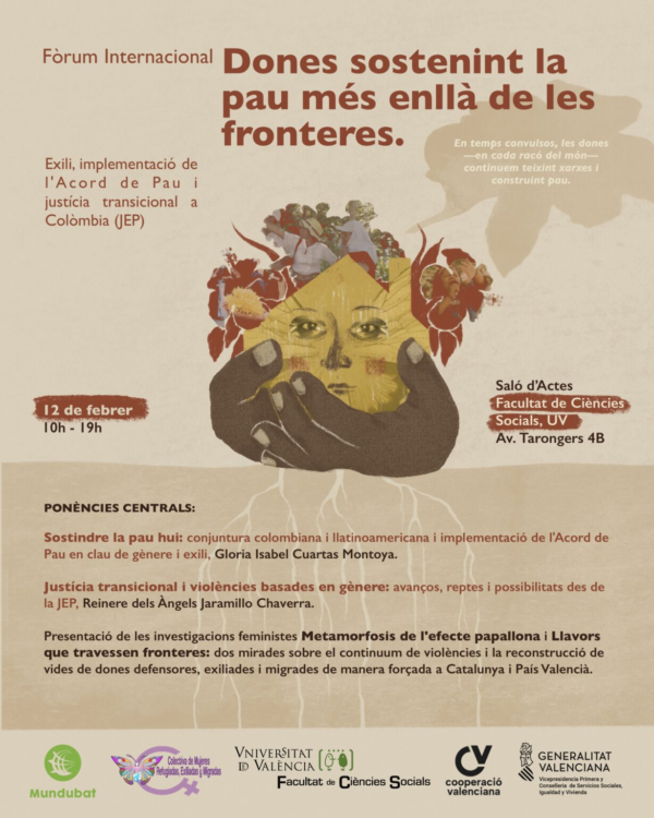 La Fundación Mundubat y la Colectiva de Mujeres Refugiadas, Exiliadas y Migradas organizan el próximo 12 de febrero en València el Foro Internacional ‘Mujeres sosteniendo la paz más allá de las fronteras’. Un espacio de escucha, análisis político sobre el caso de Colombia y construcción colectiva de propuestas liderado por mujeres colombianas exiliadas y migradas de manera forzada. El encuentro, que tendrá lugar en el Salón de Actos de la Facultad de Ciencias Sociales de la Universidad de València, en la Avinguda Tarongers 4, busca visibilizar el exilio como una violación continuada de los derechos humanos y reconocer su impacto sobre los cuerpos y las vidas de las mujeres.