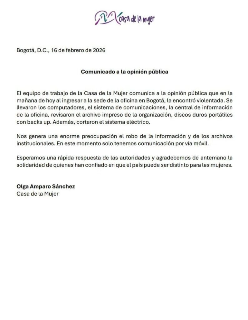 febrero 17, 2026 comparte Comunicado a la opinión pública comparte Más noticias ¡Gracias por el apoyo! febrero 17, 2026 Comunicado a la opinión pública febrero 17, 2026 Día de la Mujer en Colombia 2026: ¿Cuándo es? Está cerca la fecha febrero 17, 2026 Sena lanzó oportunidad gratis para mujeres en Colombia: cómo tener certificación clave en febrero febrero 17, 2026 Mujeres realizan Conferencia Internacional Abya Yala febrero 16, 2026 Las mujeres que crearon la primera guardia afro urbana de Colombia para defender su barrio en Cali febrero 16, 2026 Colombia reduce las brechas de género para acceder a una pensión de vejez: las mujeres empiezan a cotizar menos semanas febrero 16, 2026 Colombia: arranca la conferencia “Floreceremos porque la guerra no puede acabar con nuestras raíces” febrero 13, 2026 Las mujeres que empujan la lucha por la libertad de los presos políticos en Venezuela febrero 13, 2026 Aumentan los feminicidios en Antioquia: 14 casos en 2026 y un patrón que se repite febrero 13, 2026 Más noticias