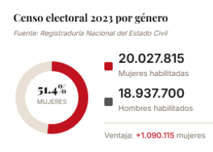 Los números son claros. En el censo electoral para las presidenciales de 2022, de 39 millones de ciudadanos habilitados para votar, 20,1 millones eran mujeres y 18,9 millones hombres, una diferencia de más de 1,2 millones de votantes a favor de las mujeres. En las elecciones territoriales de 2023, la brecha se repitió con cerca de 20 millones de mujeres frente a 18,9 millones de hombres. No es un dato aislado ni un accidente estadístico, es una constante elección tras elección.