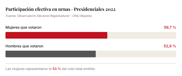 El dato más importante no está solo en el número de personas habilitadas para votar, sino en quiénes realmente llegan a las urnas. Según el informe oficial de la Registraduría Nacional y ONU Mujeres sobre las elecciones de 2022, las mujeres ejercieron su derecho al voto en mayor proporción que los hombres, con una participación de 59,7% frente al 52,8% masculino. Esto significa que entre quienes sí votaron ese día, las mujeres representaron el 53% del total. Es decir, la mayoría del electorado activo.