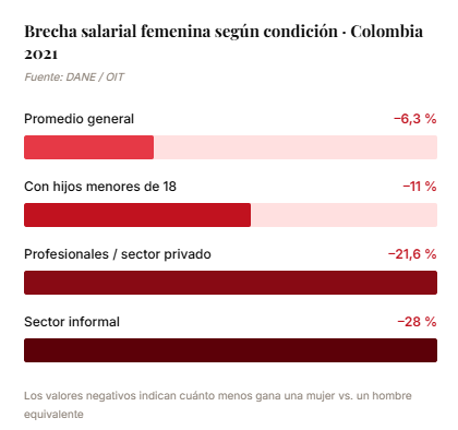 De acuerdo con el Dane, en enero de 2025 la tasa de desempleo femenino en Colombia fue de 15,8%, frente al 8,6% masculino, una diferencia de 7,2 puntos porcentuales. A esto se suma la brecha salarial. Según el Dane y la Organización Internacional del Trabajo (OIT), el ingreso mensual de las mujeres es en promedio 6,3% menor que el de los hombres, y entre mujeres con educación profesional frente a sus pares hombres la diferencia llega hasta el 21,6%. Además, las mujeres con hijos menores de 18 años ganan en promedio un 11% menos que los hombres en las mismas condiciones.