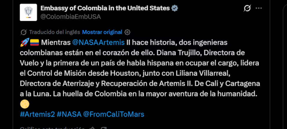 “Mientras Artemis II hace historia, dos ingenieras colombianas están en el corazón de ello. Diana Trujillo, Directora de Vuelo y la primera de un país de habla hispana en ocupar el cargo, lidera el Control de Misión desde Houston, junto con Liliana Villarreal, Directora de Aterrizaje y Recuperación de Artemis II. De Cali y Cartagena a la Luna. La huella de Colombia en la mayor aventura de la humanidad», indicó la Embajada de Colombia en Estados Unidos.
